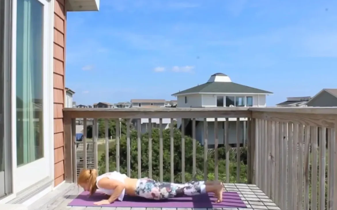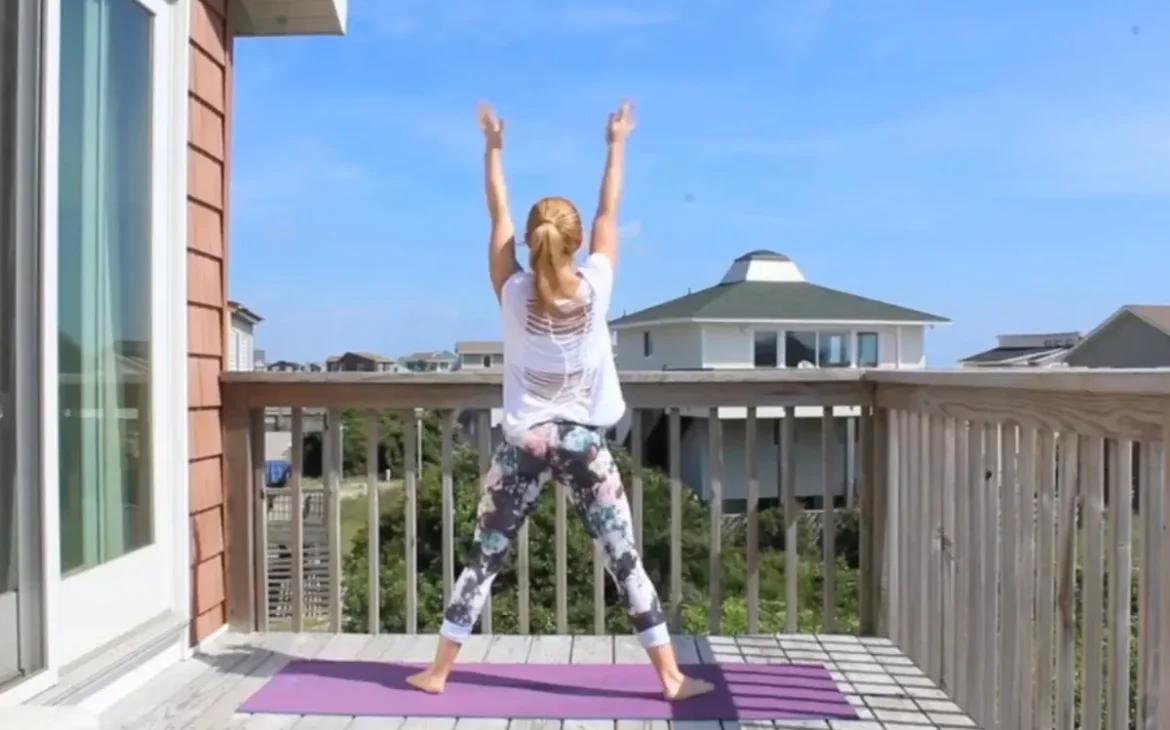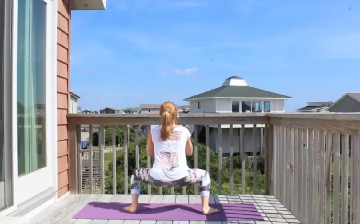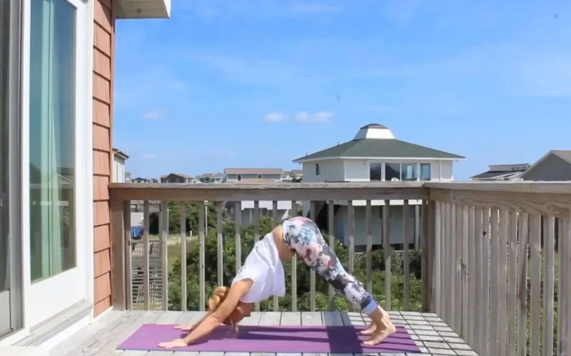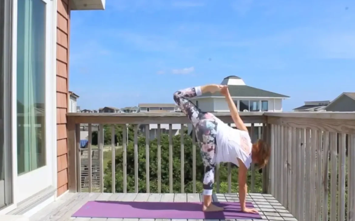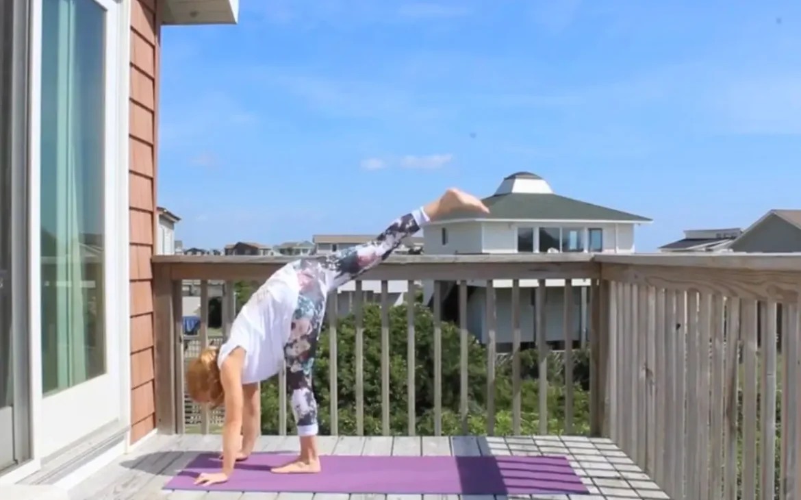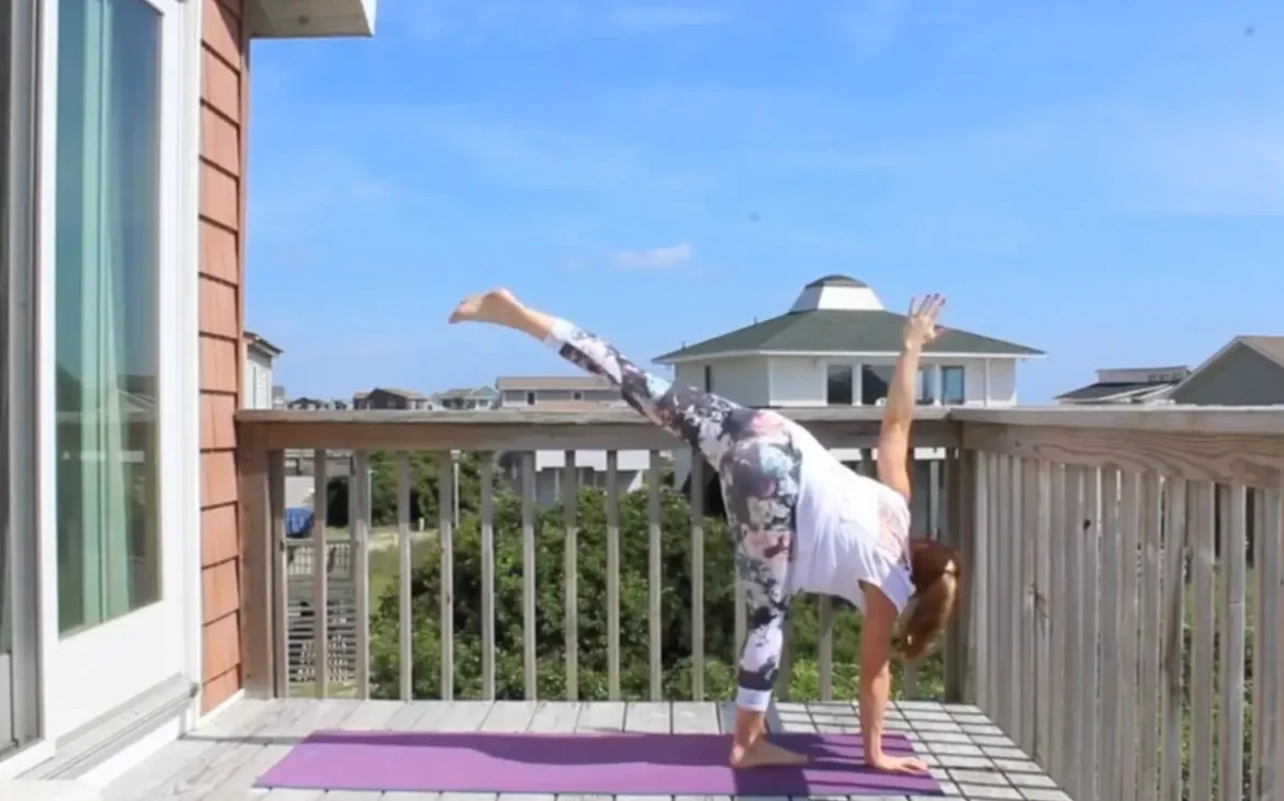 Me doing revolved side angle yoga pose on a sunny deck