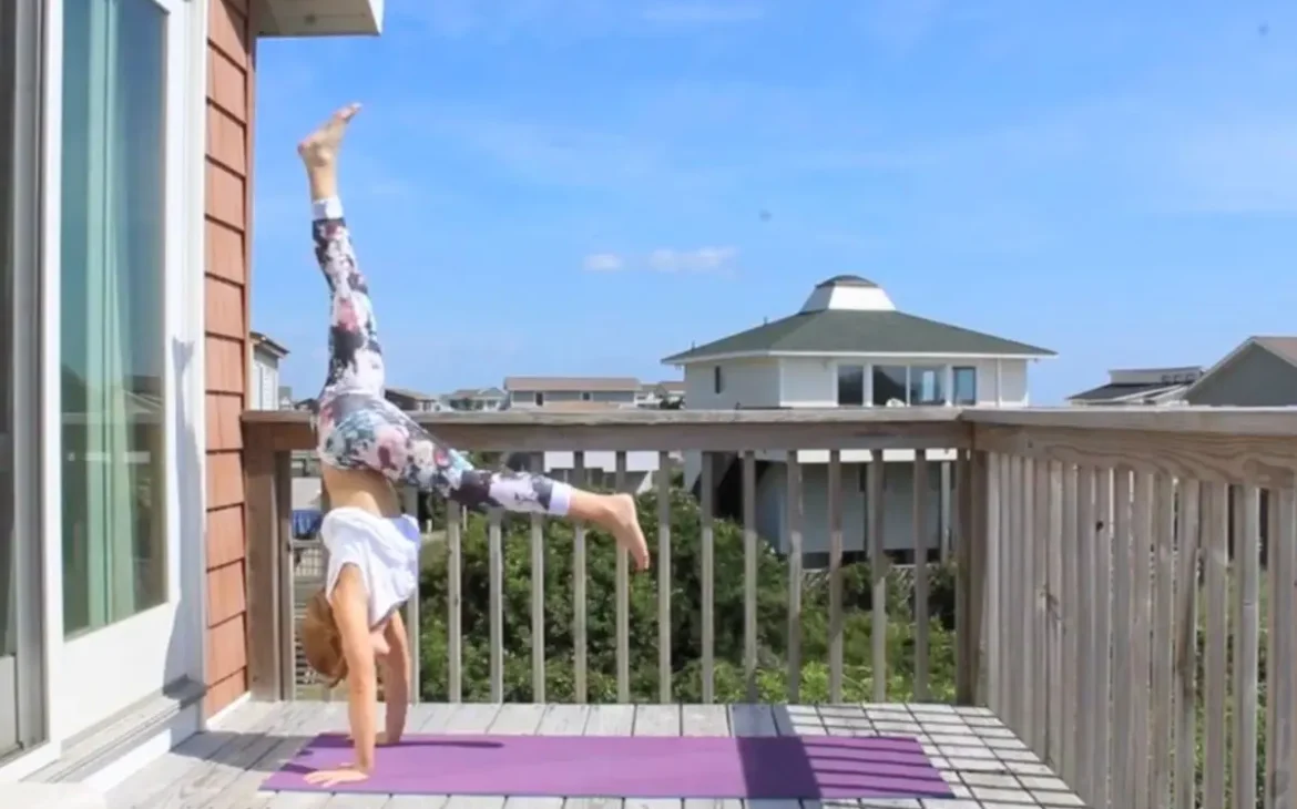 From airplane pose, move into either standing split or work on hopping up into a handstand. If you work on handstands, squeeze your stomach muscles to help stabilize while you’re up.